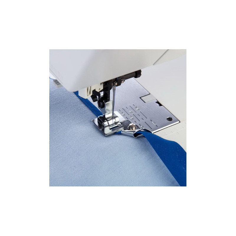6. Die mit dem Schrägband einzufassende Stoffkante zwischen den Kanten des Schrägbandes in den Schlitz des Schrägbandfußes einführen. Das Schrägband schließt die Schnittkante beim Nähen automatisch mit ein.