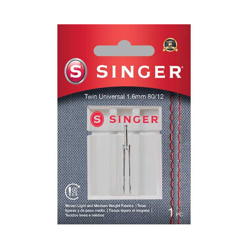 Aguja gemela universal Singer 1,6 mm tamaño 80/12, blíster 1 unidad. Ideal para costuras decorativas y precisas.