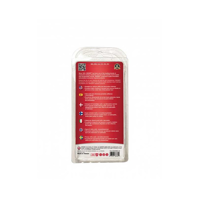 Le pied double entraînement Singer possède ses propres griffes d'entraînement qui fonctionnent en conjonction avec le système d'entraînement inférieur de la machine à coudre pour améliorer la fluidité du tissu.