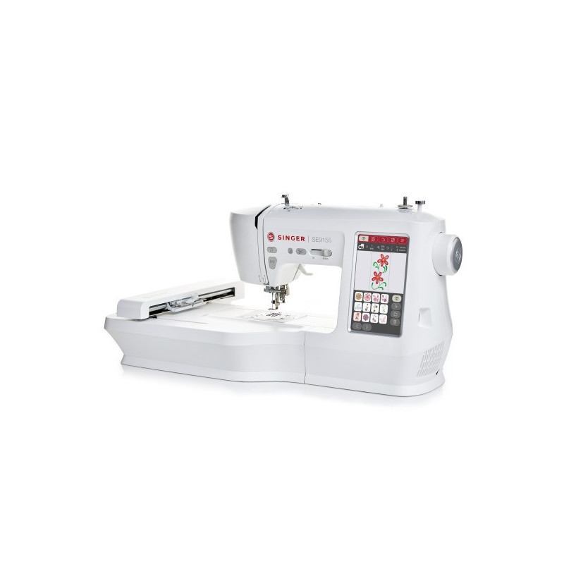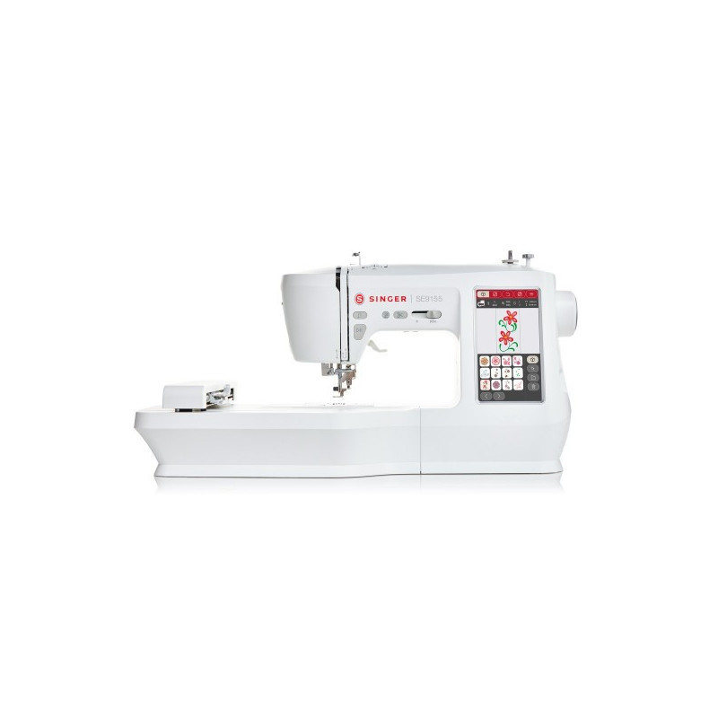 The Singer SE9155 delivers versatility with an easy-to-use touchscreen interface that allows designers to rotate, mirror, scale and combine embroidery motifs directly on screen. It features a top-drop bobbin system for easy threading, programmable needle up/down control, free-motion carving by drop-feed, and time-saving automatic thread trimming and threading. Included accessories: multiple presser feet (utility, zipper, buttonhole, blind hem, embroidery), embroidery hoop, bobbins, needles, stylus, seam ripper and more