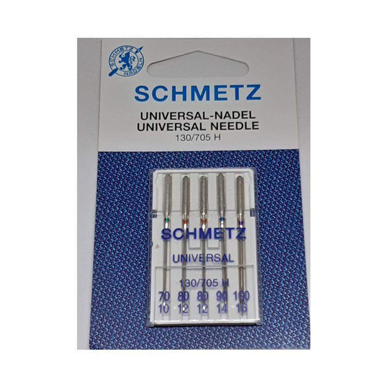 Pack of 5 assorted Schmetz needles 130/705H for versatile sewing on various fabrics.